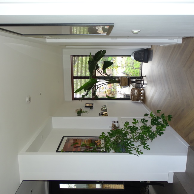 Ook de serre is aangepakt zodat het geen “bijruimte” meer is, maar een echte uitbreiding van de woonkamer. De serre kreeg een nieuw dak met lichtstraat, geïsoleerde buitenwanden en openslaande deuren. Daardoor is de ruimte comfortabeler, lichter en bruikbaar in meerdere seizoenen.