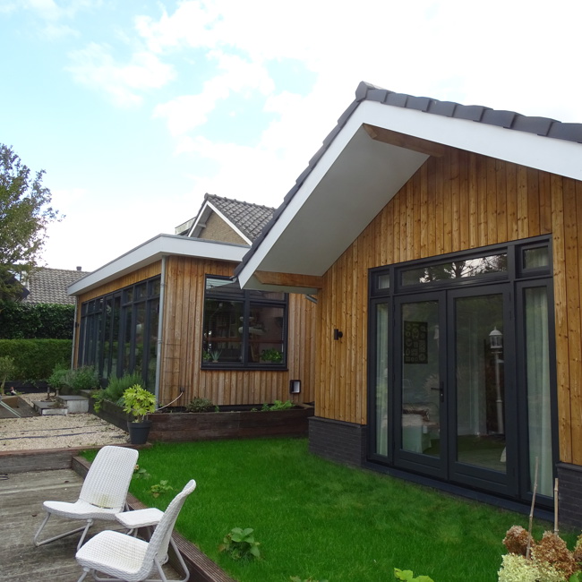 De bewoners van deze woning in Roelofarendsveen, wilden hun woning uitbreiden met een volwaardig gastenverblijf, een nieuwe serre en een schuur/garage. Het eerste ontwerp dat zij door een andere architect lieten maken, sloot niet goed aan op het budget en de woonwensen. Wij keken mee met dit ontwerp, en zijn aangehaakt om het plan praktisch en haalbaar te maken. Samen hebben we het aangepast naar een oplossing die wél klopt, zowel qua gebruik als kosten. Daarna hebben we het complete traject uitgevoerd, van doorgang in de woning tot afwerking.