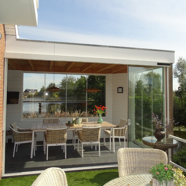 Tot slot is de bestaande overkapping verbouwd tot een volwaardige tuinkamer met glazen schuifwanden: een fijne plek waar je in het voor- en najaar heerlijk kunt zitten.